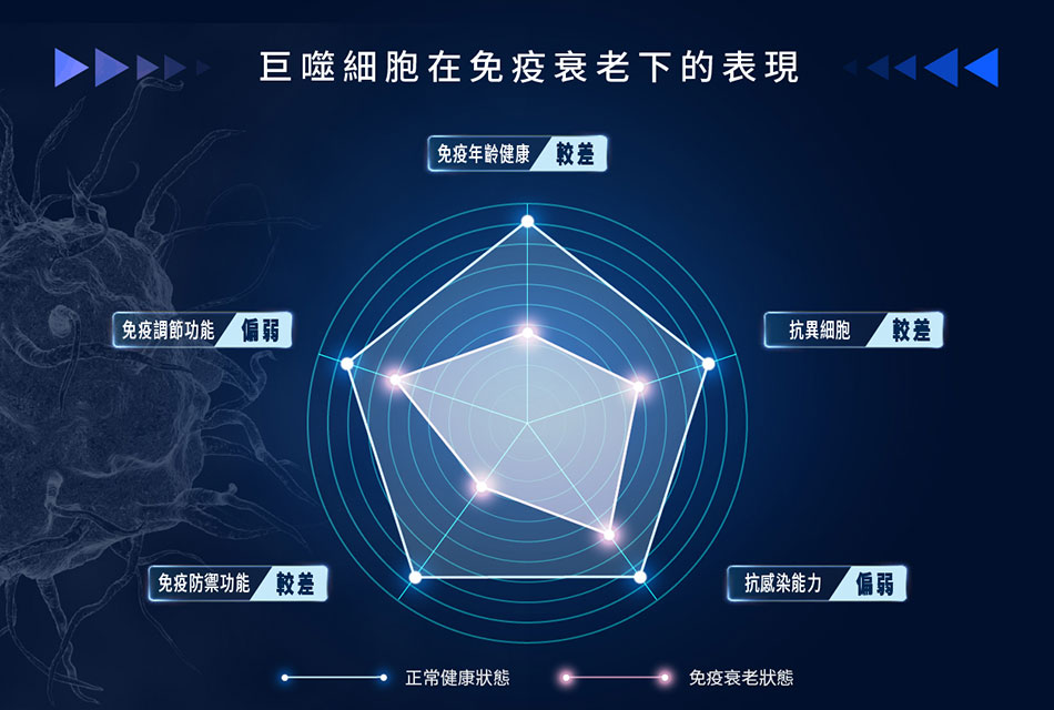 然而隨年齡增長,巨噬細胞活性逐漸下降,出現免疫衰老(Immunosenescence)。其辨識、吞噬和分解的能力明顯減弱,導致異源體和老廢細胞在體內堆積,並釋放有毒物質,引發慢性發炎。這不僅加速衰老、增加感染風險,還會損害周邊健康細胞,造成組織或器官功能衰退。這種惡性循環進一步削弱免疫防禦能力,持續加劇衰老過程。