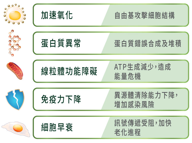 年老、營養失衡、缺乏運動、疾病等多種因素,會抑制自噬作用,導致細胞廢物(如受損線粒體、蛋白質錯誤折疊)堆積;不僅佔據空間,更會阻礙細胞訊號傳遞,干擾細胞正常運作,引發惡性循環。