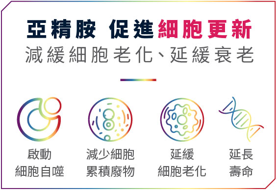 亞精胺是天然多胺,越來越多研究顯示,能激活細胞自噬,減緩細胞老化;可從大米胚芽、大豆或營養補充品攝取。其作用機制包括:誘導自噬作用、清除細胞廢物,從而促進細胞更新、提升細胞存活率、延緩衰老。