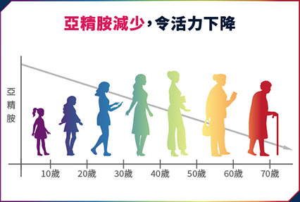 人體年紀愈大,細胞內亞精胺就會減少,令活力下降,增加與衰老有關的疾病風險。同時,研究證實亞精胺有效阻止細胞老化,並對抗與身體衰老關的疾病。